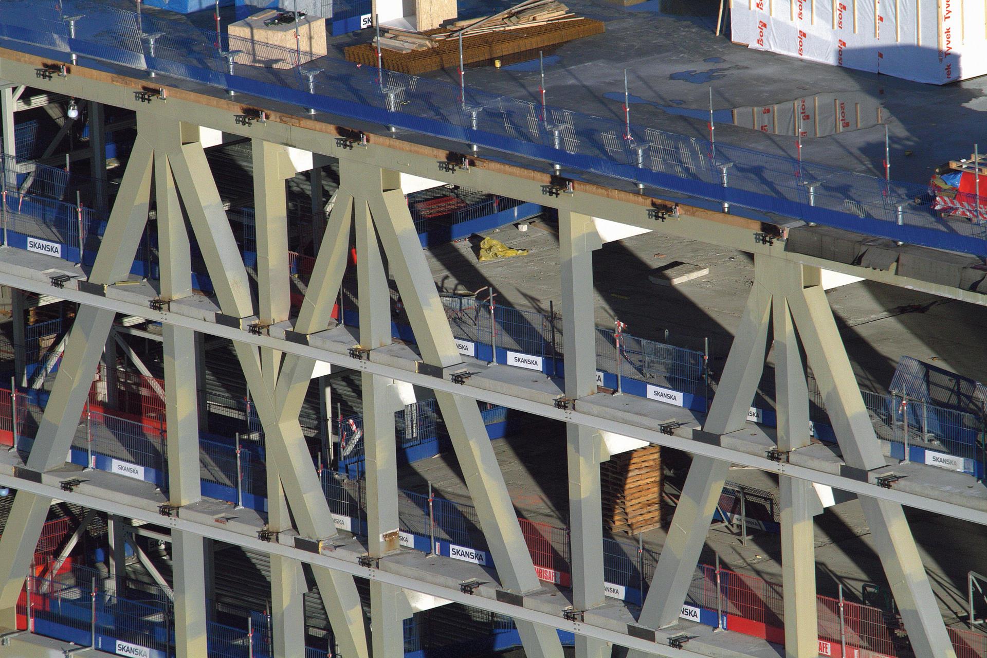 Large-scale truss elements for lamellas were welded on-site (length 30 m, height 12,5 m, weight 100 ton). The trusses were lifted into place with lattice boom crawler crane, one of the biggest in Europe.