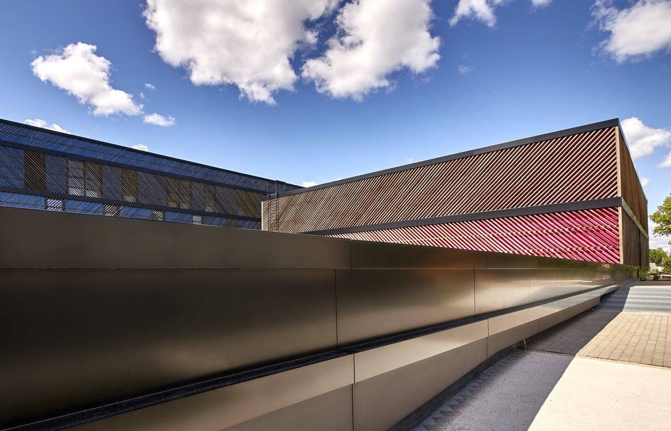 The see-through timber paneling and the varying facade colours create a dynamic, sporty feeling when walking alongside the building.