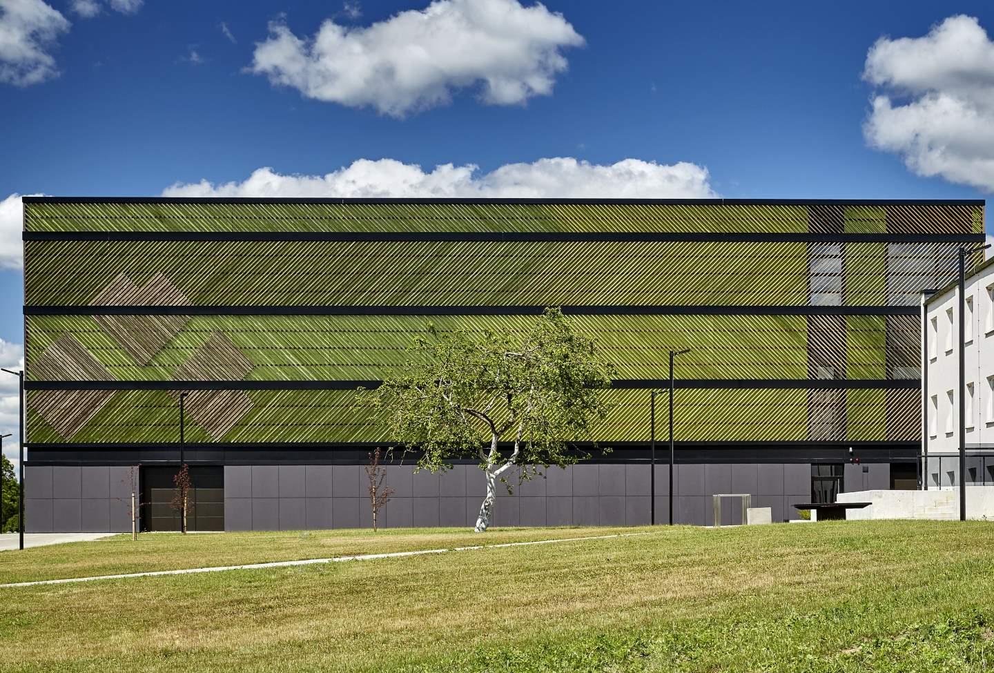 The hall's front, which is finished with colourful metal walls cladded with timber, matches nicely the nearby forest skyline.