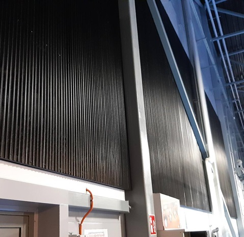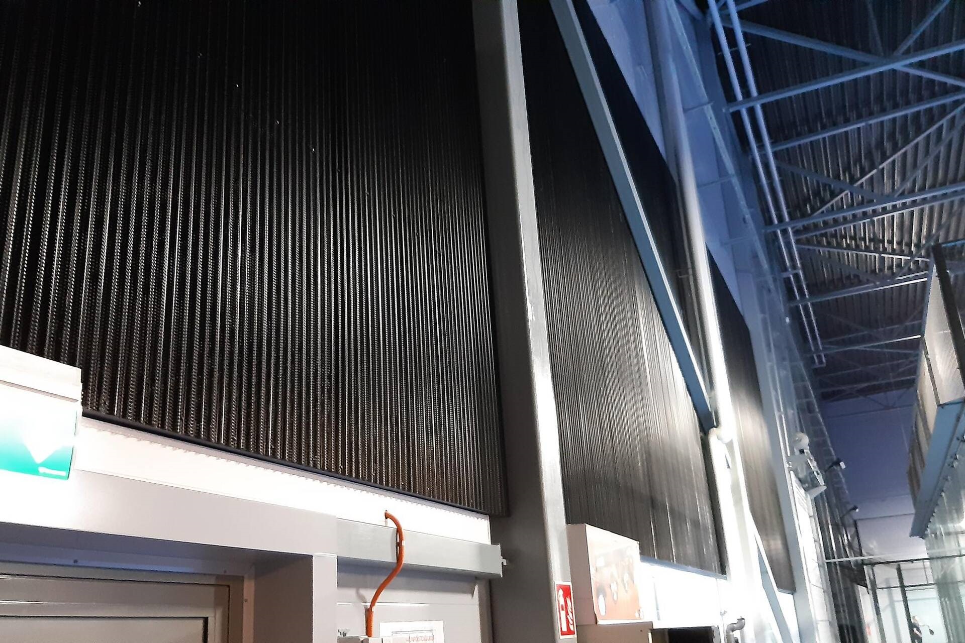 Sandwich panel SPA 150 E, in colors RR41 and RR23 were chose for wall elements for the padel hall. The hall's interior walls are partly clad with the striking Design Venice S10 profile, which is black (RR33) and has a perforation degree of 30%.