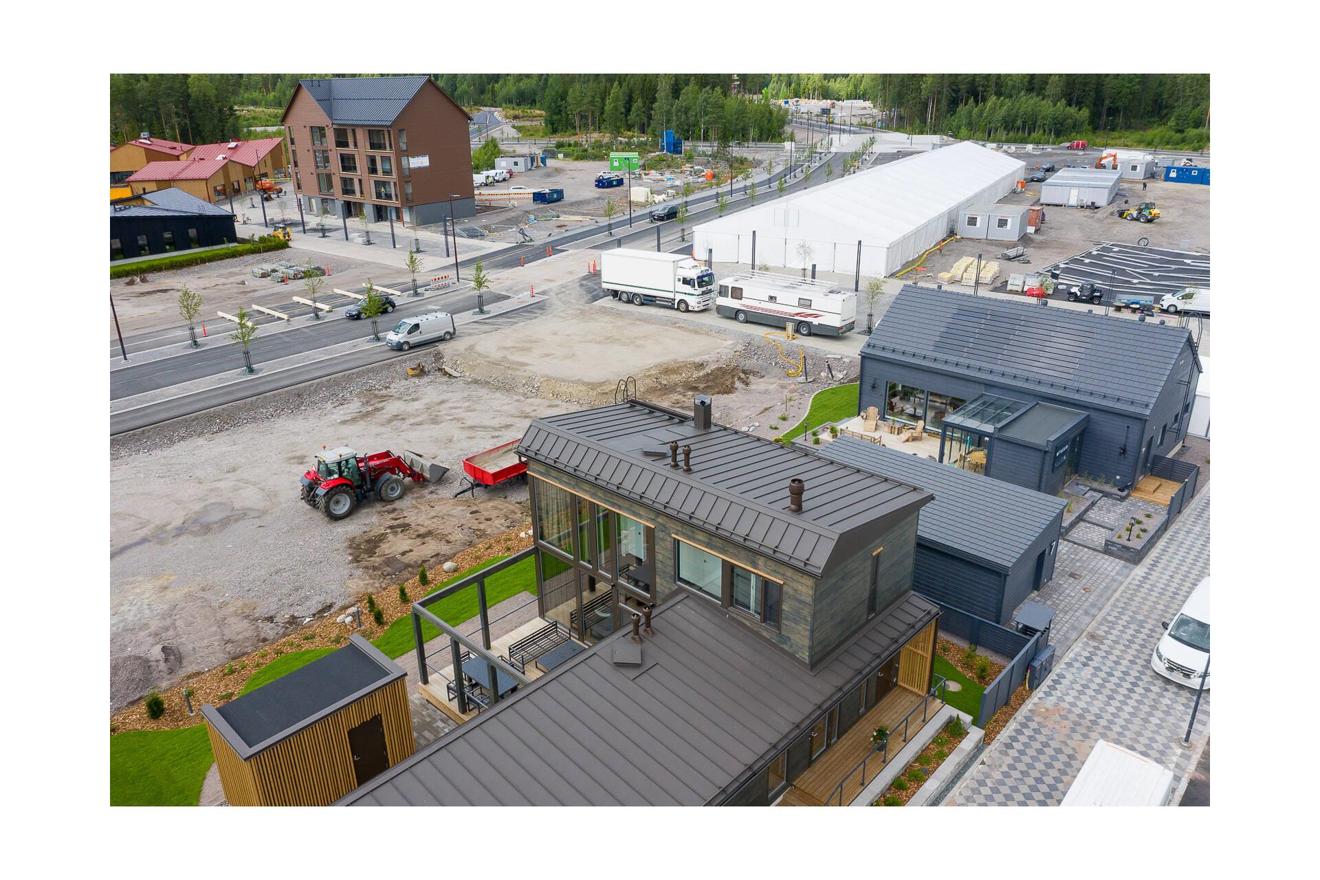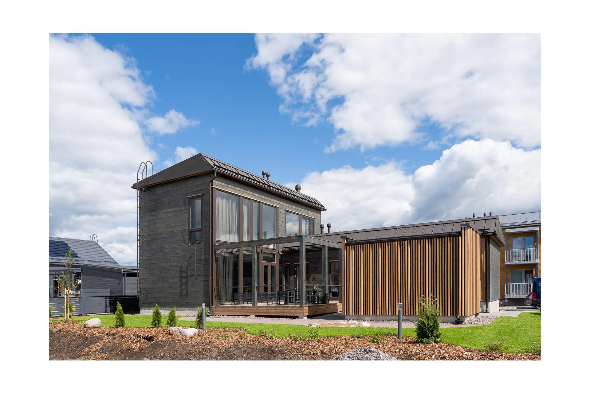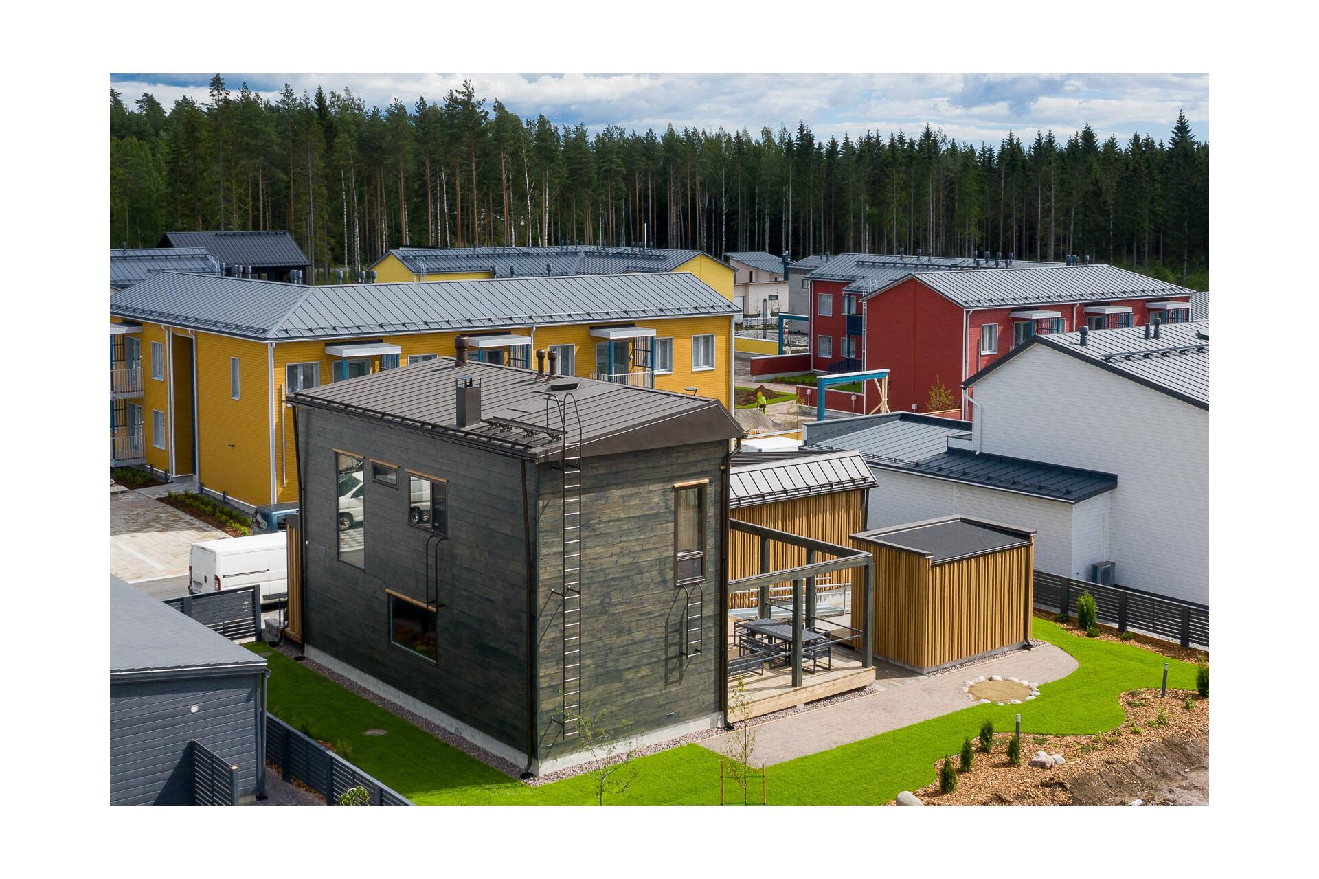 Kontion hirsitalon katteena on Ruukki Classic tummanruskeana (RR32). Toimitukseen sisältyivät myös läpiviennit sekä paloluukku.