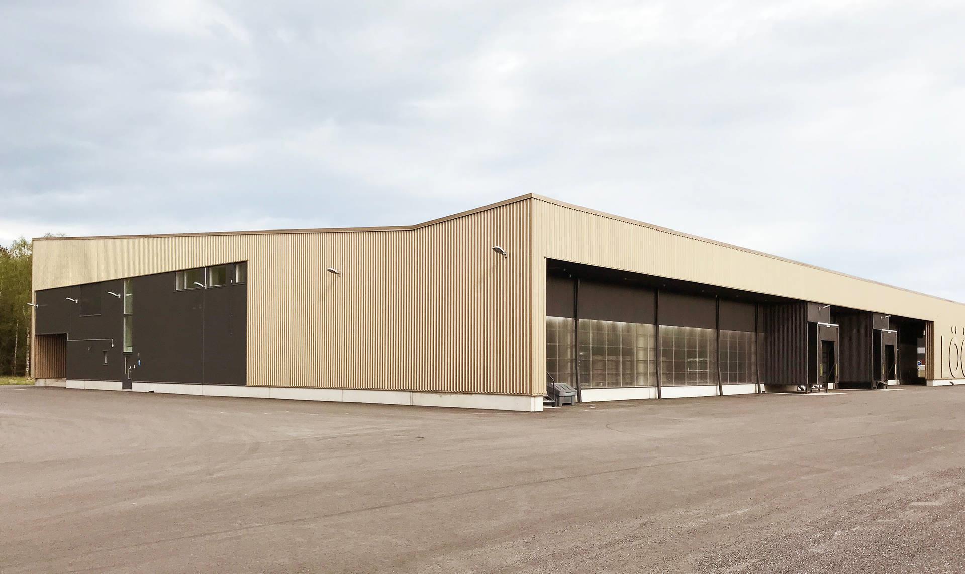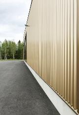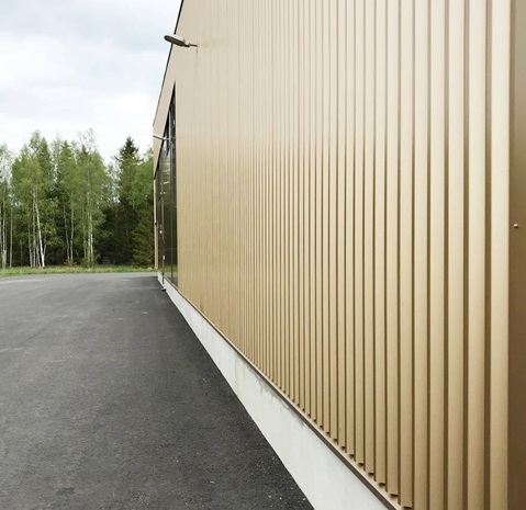 Ruukki toimitti rakennuksen julkisivun kullan väriset poimulevyt ja ne asennettiin pystysuuntaisesti.