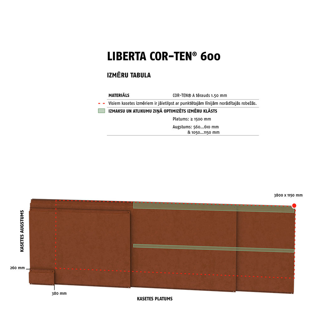 Cor-Ten A markas tērauds tiek izmantots kasešu ražošanai (S355J0WP-COR-TEN A).