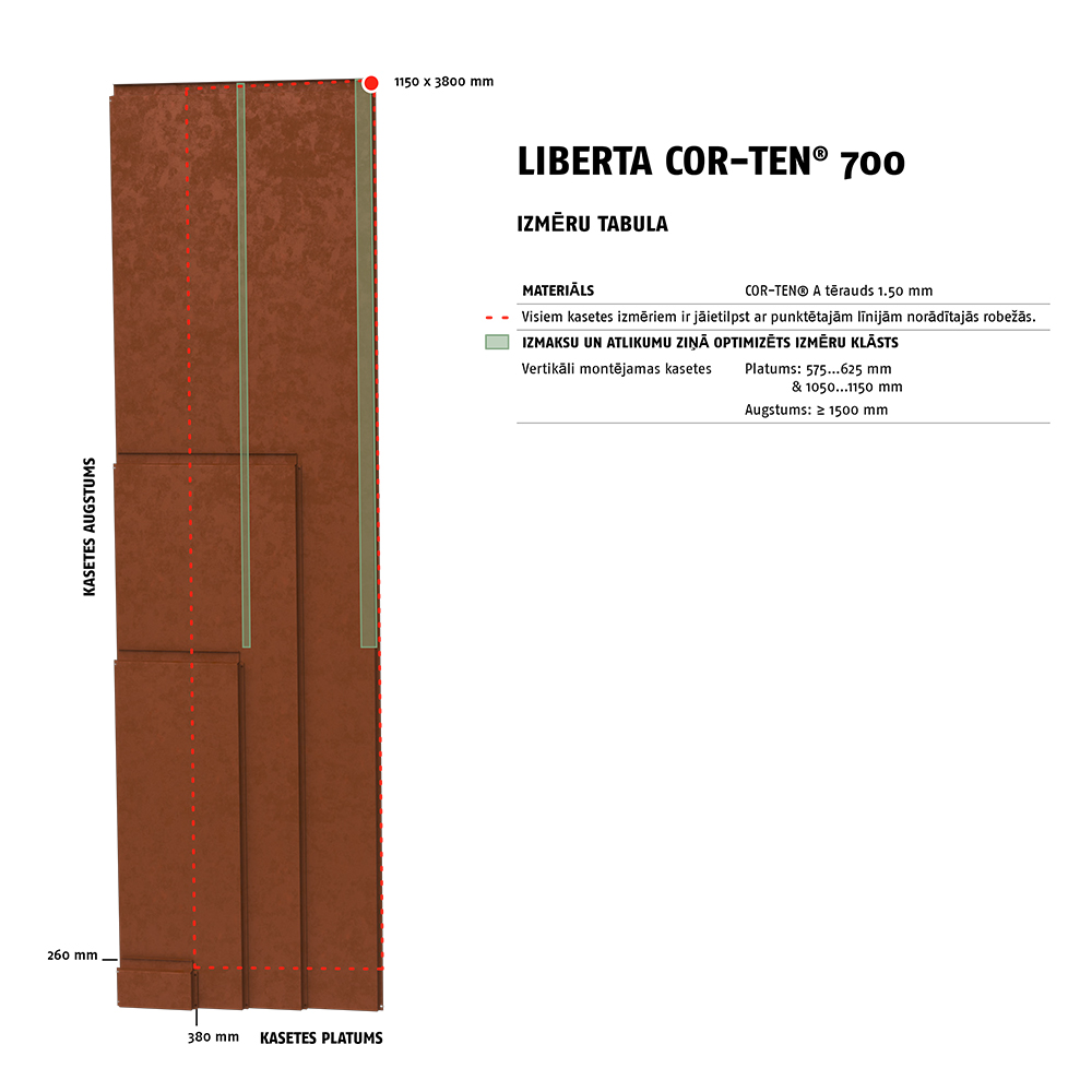 Cor-Ten A markas tērauds tiek izmantots kasešu ražošanai (S355J0WP-COR-TEN A).