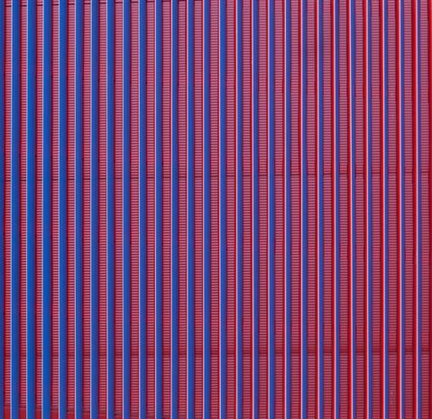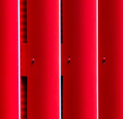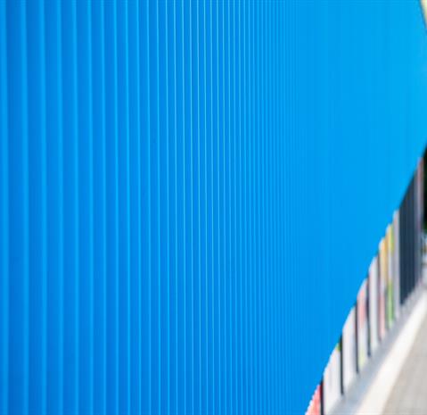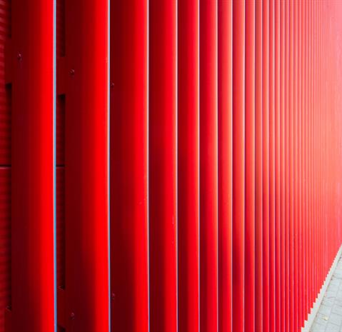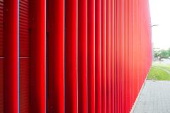 Envelope of the building is based on Ruukki Forma facade system – designed solution for sandwich panels with additional cladding. In this project some modifications were made and regular studs were replaced with special designed and produced fixing clamps. Also stencils were made to simplify its installation. Special lamellas were made of 1,2 mm aluminum and powder painted with two colors.