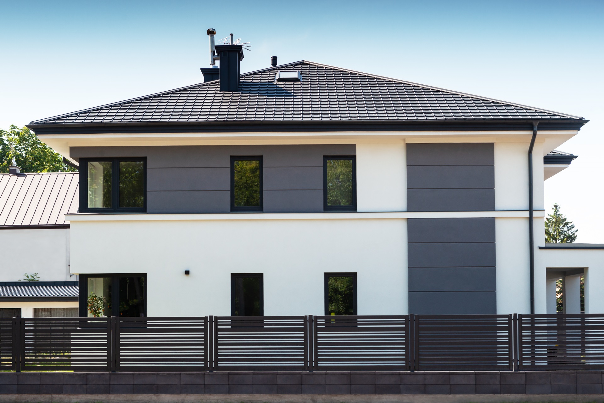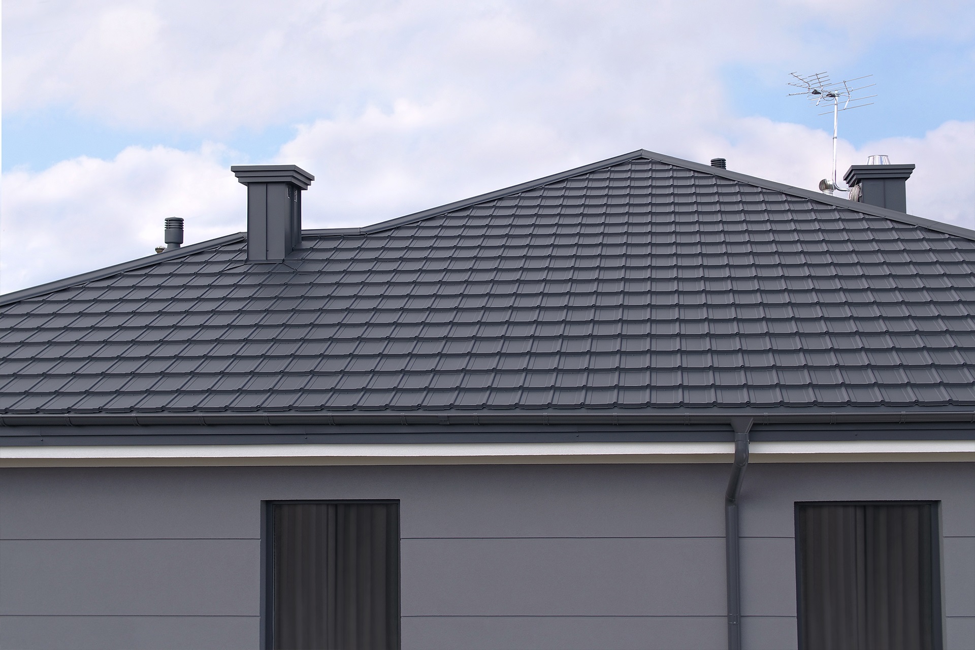 - Dach nowoczesny – blachodachówka modułowa wygląda świetnie na cieszących się powodzeniem dachach dwuspadowych i płaskich.